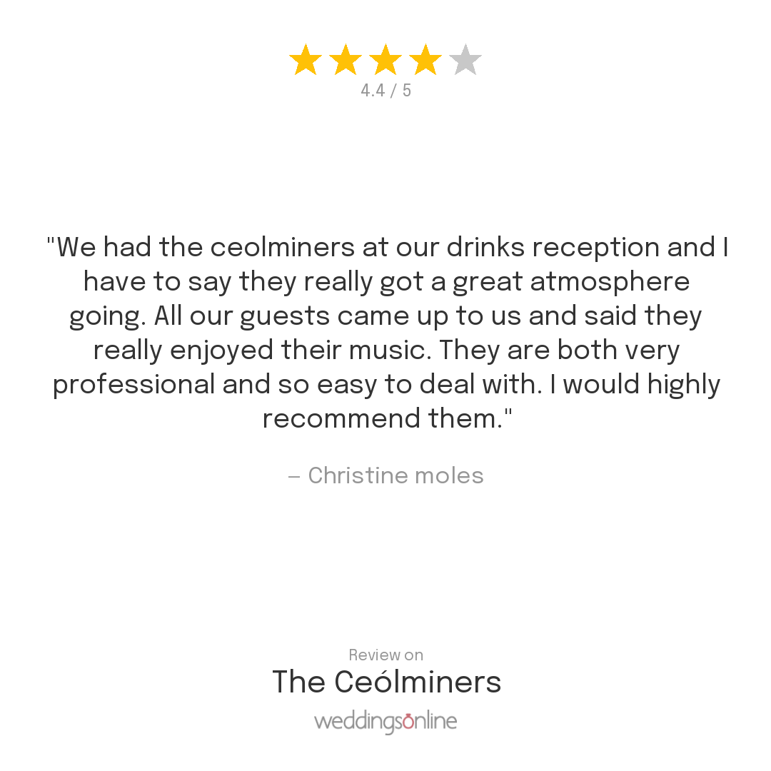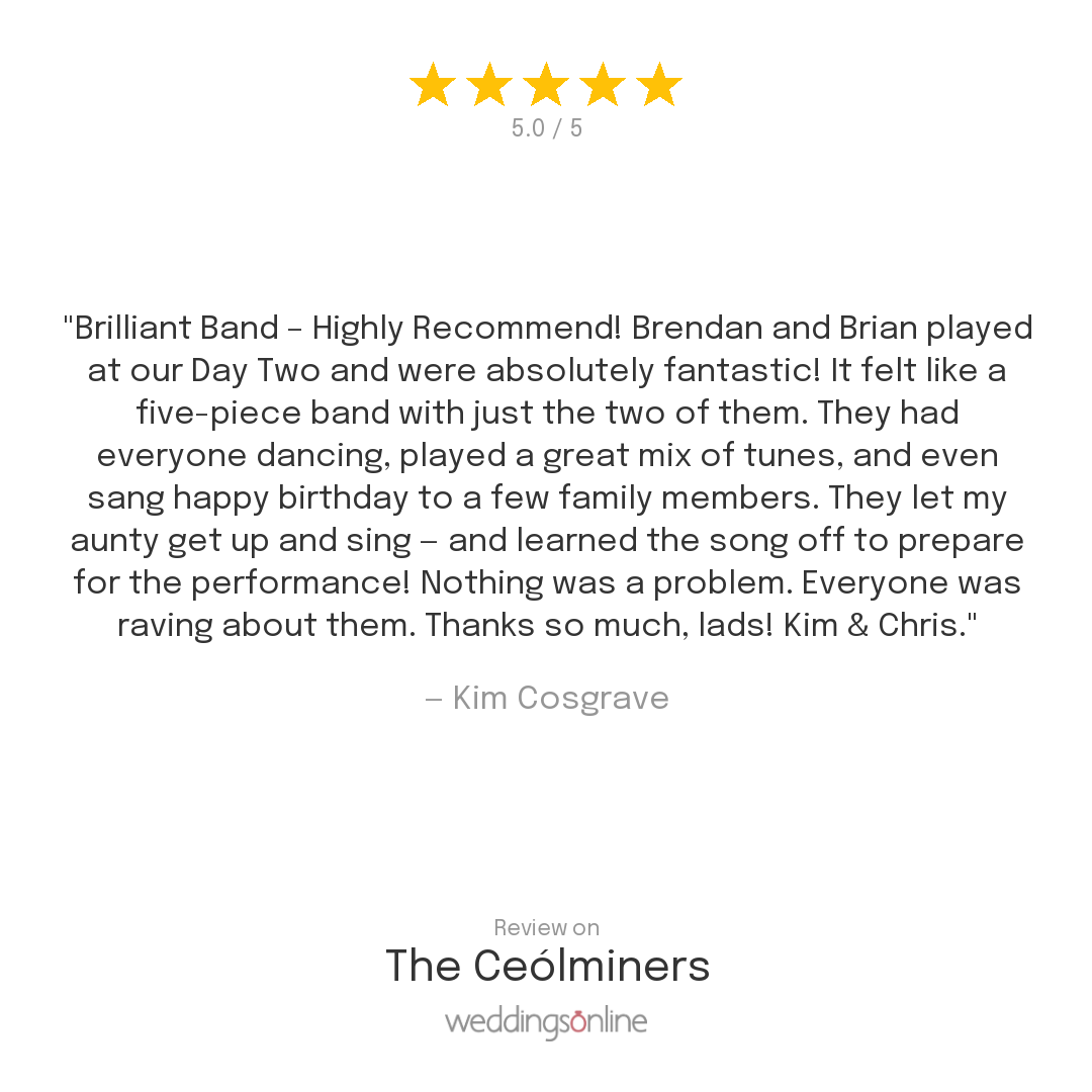 We had the ceol miners play at our day two celebrations. Brendan was a pleasure to deal with during the booking and on the day .. they showed up and set a Great fun atmosphere for us and our guests . A great way to add some traditional Irish craic to your event . Thanks again lads ! Louise - Day 2 09/2025